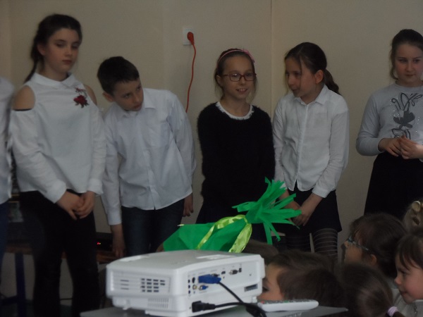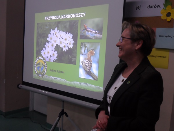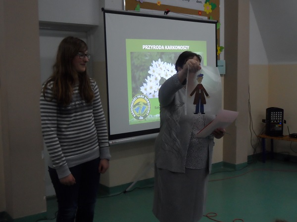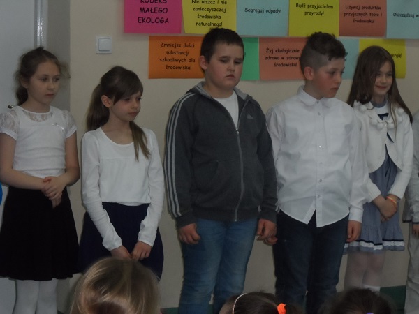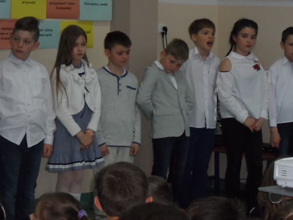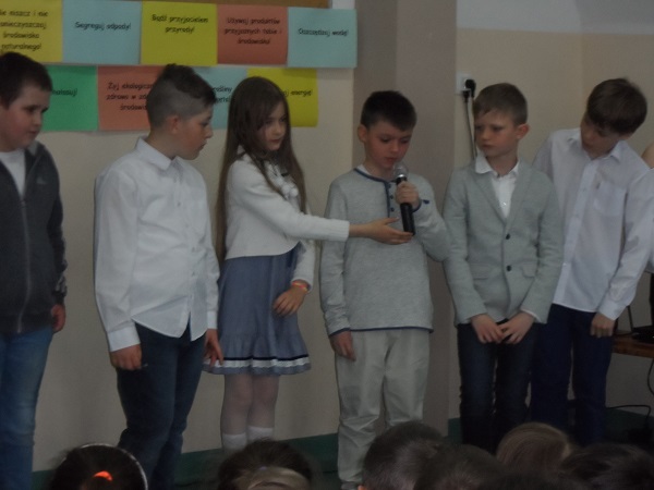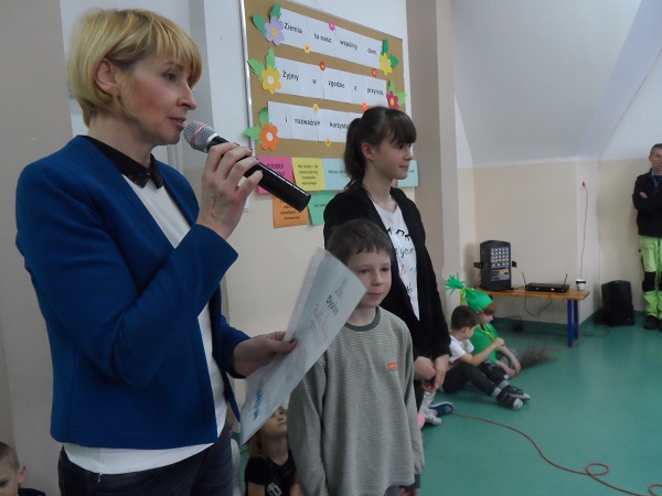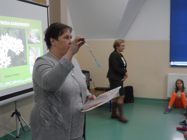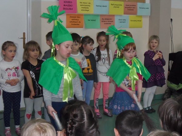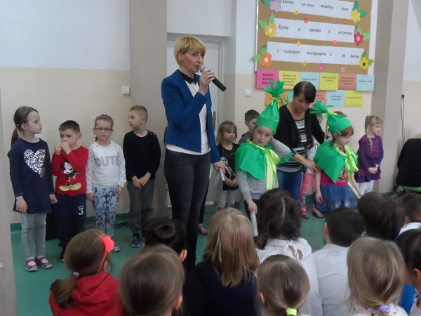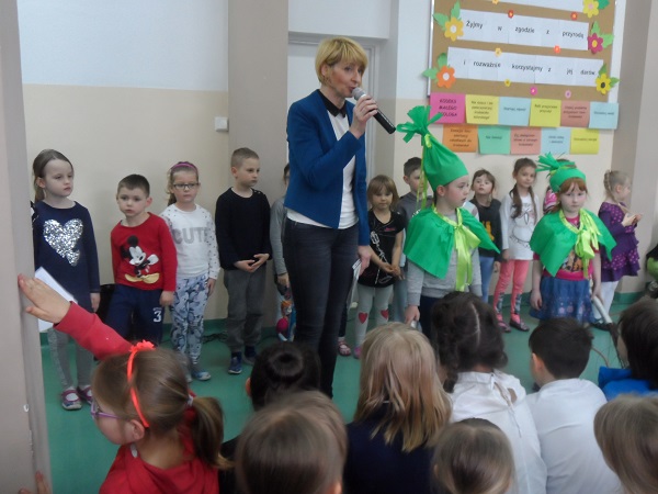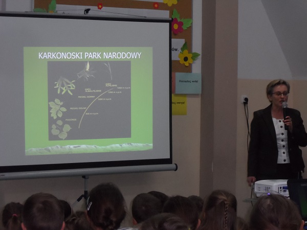Dnia 21 kwietnia 2017 roku uroczyście obchodziliśmy Dzień Ziemi. Gości i klasy 0 - VI przywitała Pani Dyrektor, Justyna Kozik. Na zaproszenie Pani Iwony Kijowskiej - Stobińskiej piękną prelekcję na temat Karkonoskiego Parku Narodowego i przyrody Karkonoszy wygłosiła Pani Sabina Tabaka, pracownik dydaktyczny Karkonoskiego Centrum Edukacji Ekologicznej w Szklarskiej Porębie. Prelekcji towarzyszyła prezentacja multimedialna sterowana przez Pana Krzysztofa Zajączkowskiego. Wszyscy nagrodzili Panią Sabinę Tabakę gromkimi brawami. Potem na scenę została poproszona klasa III b, która pod opieką Pani Iwony Kijowskiej - Stobińskiej przygotowała ciekawy występ na temat poszanowania przyrody i życia w zgodzie z naturą oraz rozważnego korzystania z darów Ziemi. Trzecioklasiści wspaniale zaśpiewali piosenkę o tematyce ekologicznej i przedstawili kodeks młodego ekologa. W programie artystycznym wzięły też udział dzieci z oddziału przedszkolnego przygotowane przez Panie: Bożenę Bąk i Ludwikę Malinowską. Przedszkolaki perfekcyjnie recytowały wiersze i śpiewały piosenki o tematyce ekologicznej. Występujący zostali nagrodzeni brawami przez publiczność.