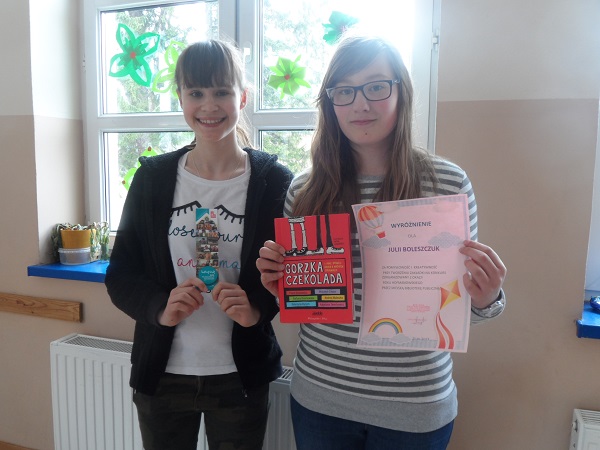 Podczas apelu Pani Halina Szyl, kierownik Biblioteki Miejskiej, pokazała wydrukowaną zakładkę do książki autorstwa Emilii Wajdowicz z klasy VI naszej szkoły i Wiktorii Zawadziłło z Gimnazjum w Szklarskiej Porębie. Te dziewczynki zdobyły pierwsze miejsce w konkursie na zakładkę do książki z okazji Roku Hofmanowskiego i formą nagrody było jej profesjonalne wydrukowanie i włączenie do obiegu. Pani Halina Szyl nagrodziła Julię Boleszczuk z klasy VI książką i dyplomem za zdobycie wyróżnienia w konkursie na zakładkę.