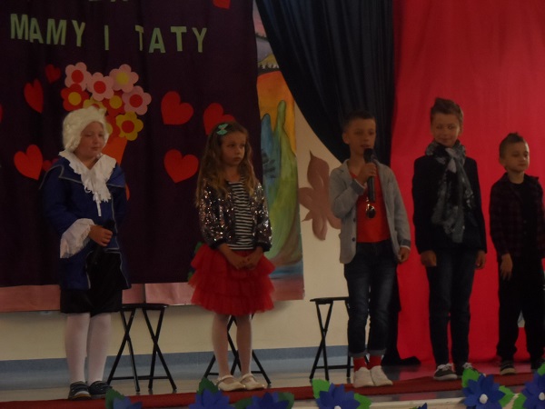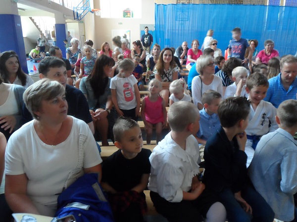 Potem obejrzeliśmy widowiskowy pokaz karate, pokaz udzielania pierwszej pomocy, strącanie pachołków strumieniem wody pod opieką strażaków. Raczyliśmy się kiełbaską z grilla, pysznymi ciastami upieczonymi przez Rodziców, lodami. Dzieci i Rodzice wzięli udział w miniwarsztatach artystycznych - zdobieniu balonów, twarzy, rysowaniu portretów i przyklejaniu ich na ogromnym sercu, strzelaniu z karabinków laserowych, pokonywaniu rodzinnego toru przeszkód, konkursach przyrodniczych przy stoisku przygotowanym przez Karkonoskie Centrum Edukacji Ekologicznej, rozgrywkach szachowych prowadzonych przez Pana Lecha Rębisza. Klasa VI zorganizowała kącik z nietrudnymi pytaniami i fantami. Pani Natalia Knapińska pięknie ozdobiła "słodkimi" dekoracjami amfiteatr.