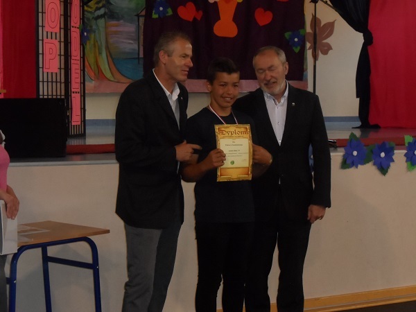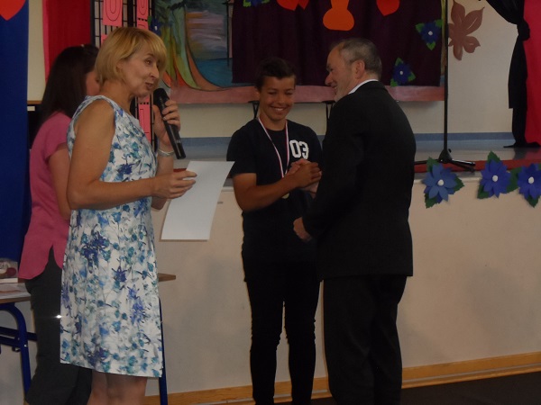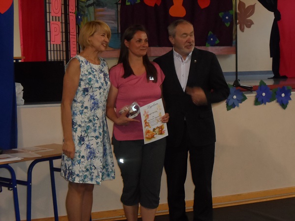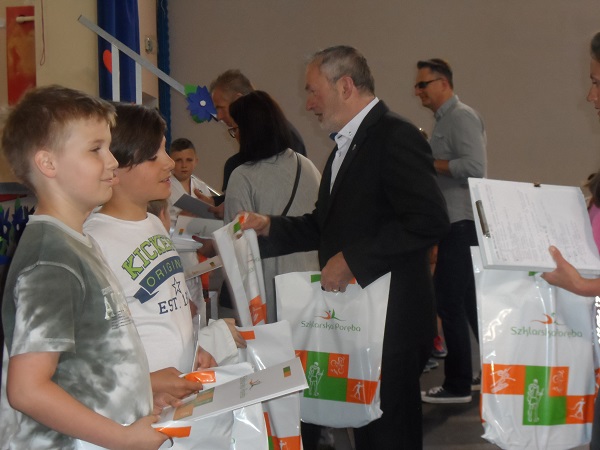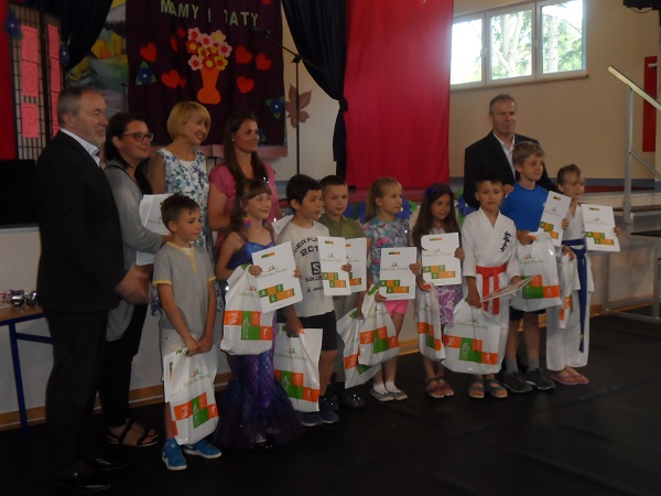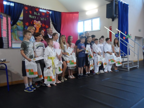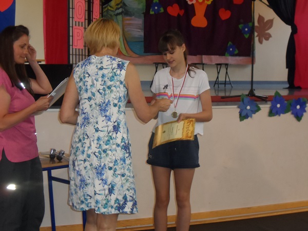 W dalszej części spotkania Pani Justyna Kozik i Pani Lucyna Żywicka wyróżniły najlepszych sportowców klas młodszych i starszych dyplomami i upominkami. Pani Lucyna podziękowała serdecznie Tymonowi Świtalskiemu z klasy III b, Maksymilianowi Biernatowi z klasy V, Emilii Wajdowicz z klasy VI, Wiktorowi Żmudzińskiemu z klasy VI za szczególne zasługi sportowe i odczytała długą listę zawodów, w których brali udział i zdobyli znaczące miejsca. Upominki i dyplomy wręczali naszym sportowcom zaproszeni Goście. Pani Dyrektor nagrodziła Panie: Lucynę Żywicką. Dorotę Kuchmistrz, Ewę Buchlę i Pana Lecha Rębisza dyplomami z tytułem SUPERTRENERA.