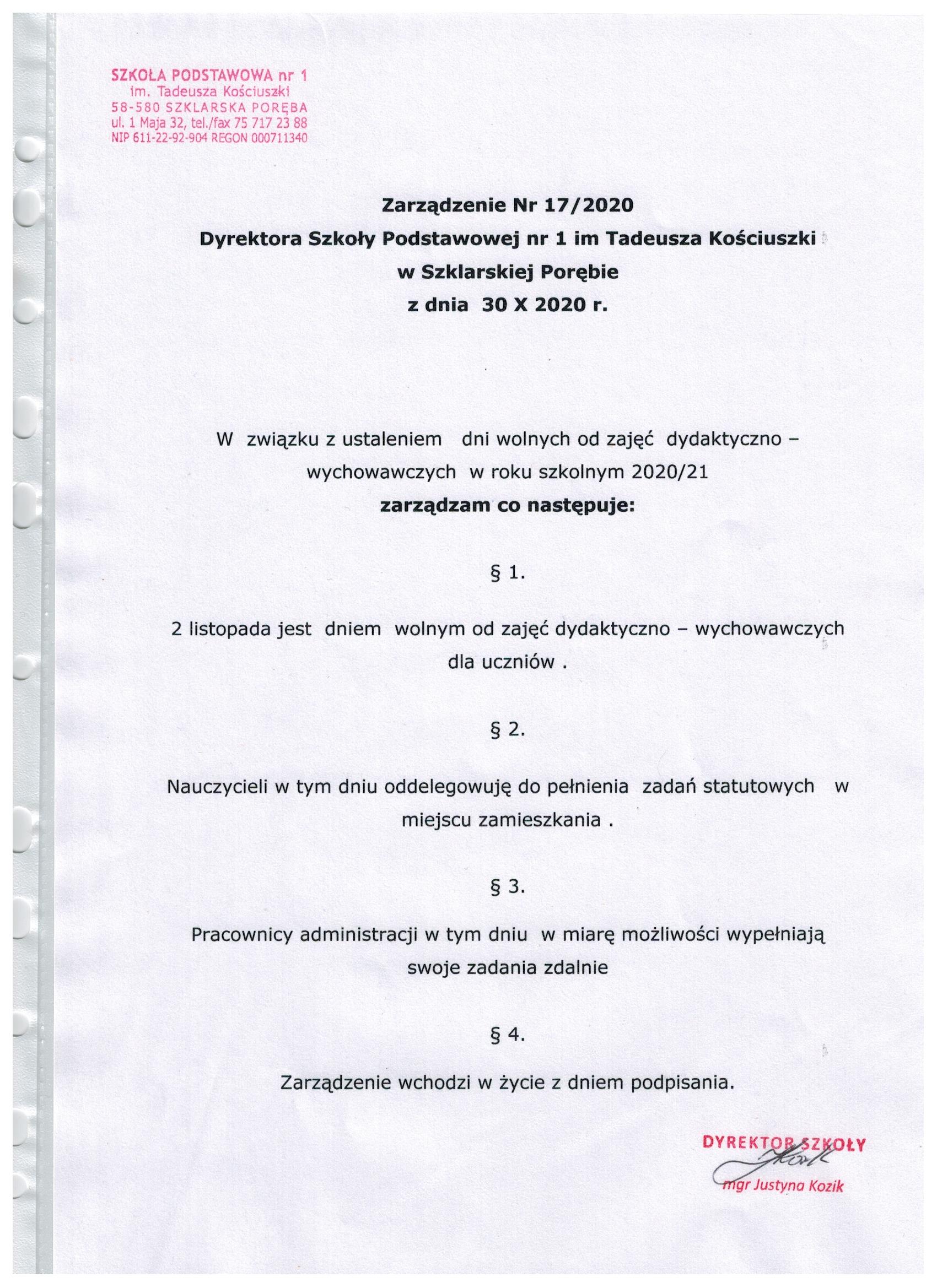Zarządzenie dyrektora w związku z ustalonym dniem wolnym 2 listopada 2020