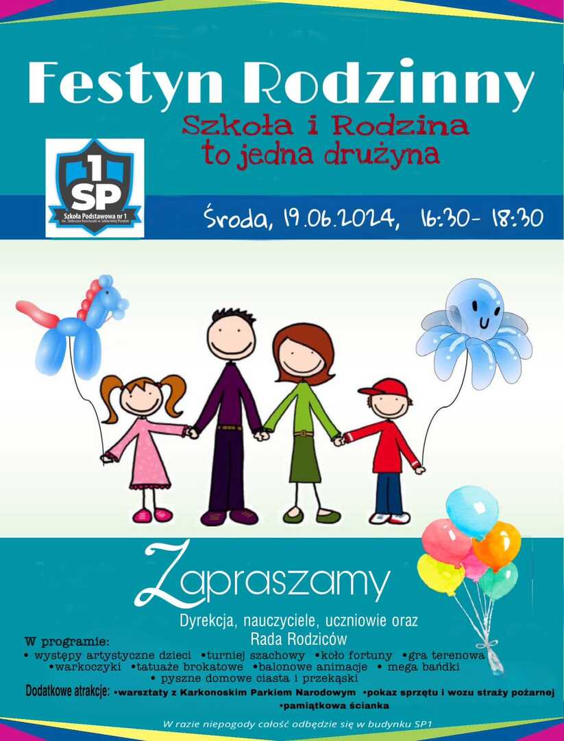 19 czerwca zapraszamy na festyn rodzinny pod hasłem : " Szkoła i Rodzina to jedna drużyna " Zbieramy pieniadze na wyposażenie kącików relaksacyjnych i gier stolikowych na korytarzach szkoły.