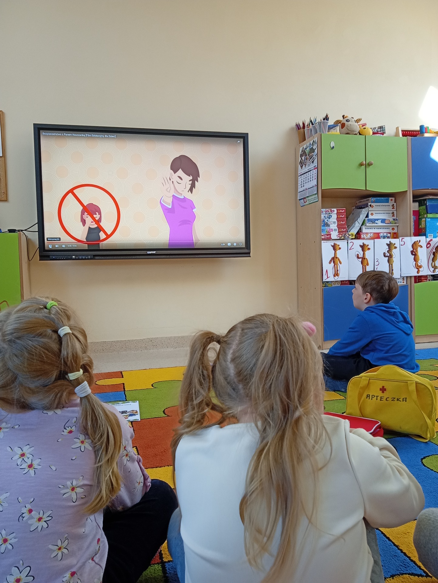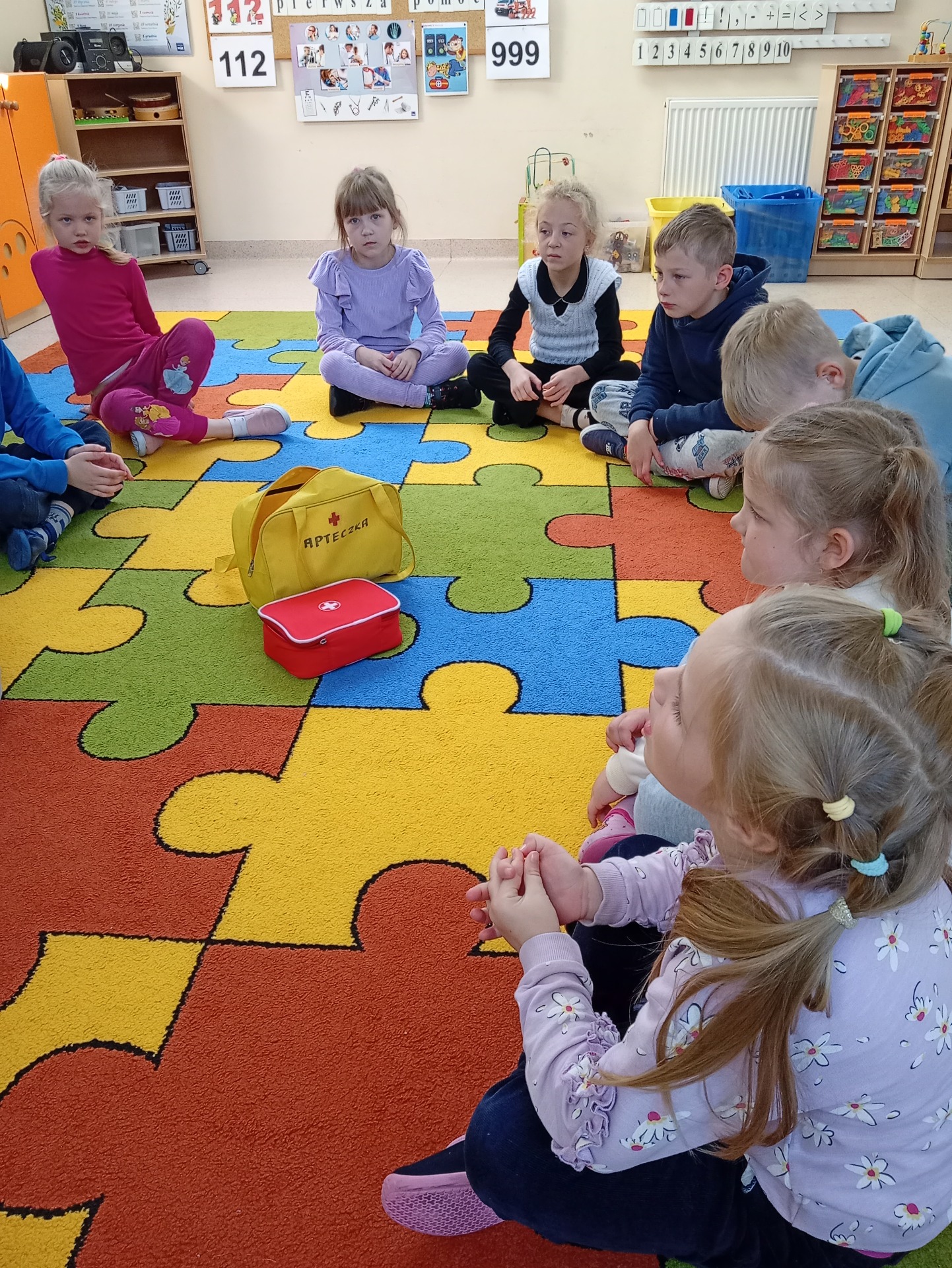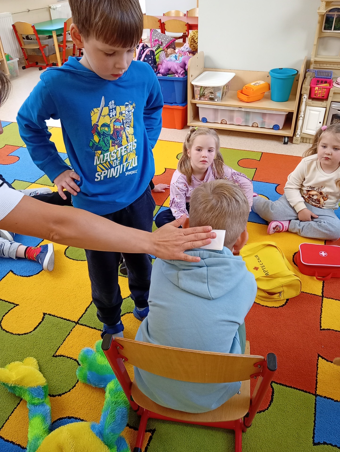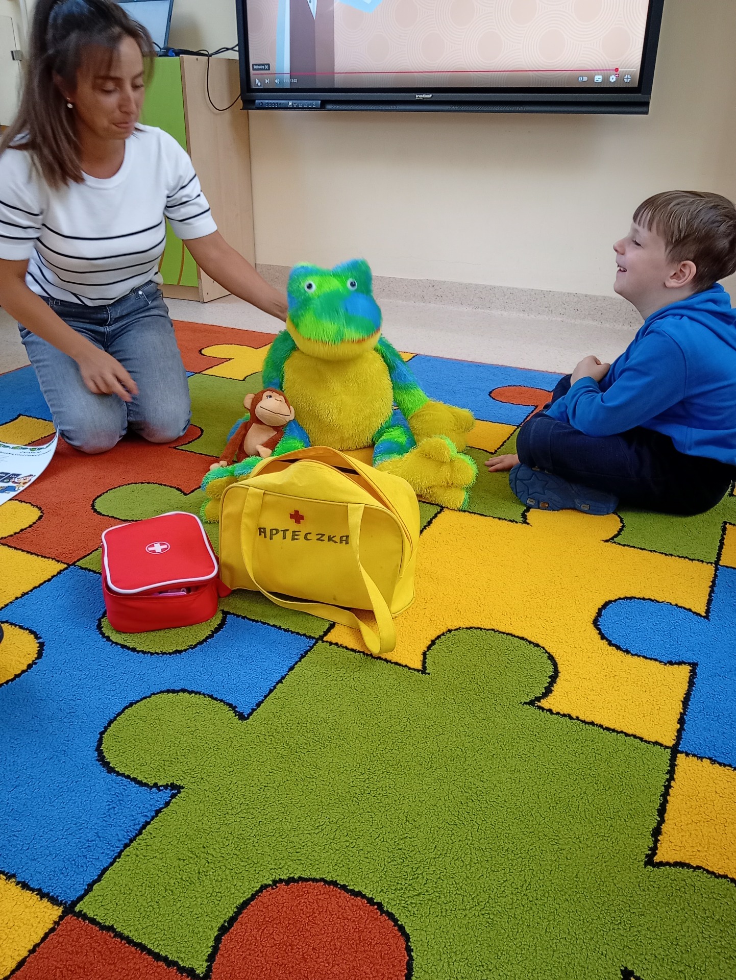 Dzisiaj Małpka Iwona uczyła nasze przedszkolaki , jak udzielać pierwszej pomocy. Na zajęciach pomocną łapką służyła sympatyczna Żabka Żaneta, z którą dzieci ćwiczyły układanie osoby w pozycji bezpiecznej. Zachęcone jej przykładem dzieci same wchodziły w rolę osoby poszkodowanej, a mali ratownicy spieszyli im z pomocą. Zorganizowaliśmy również mały “Teatrzyk z apteczką w ręku”. Przygotowaliśmy scenki, podczas których dzieci demonstrowały, jak udzielać pierwszej pomocy w konkretnych przypadkach. Nasze Krasnoludki świetnie się bawiły pod czujnym okiem mądrej Małpki Iwony. Nie zabrakło żartów i śmiechu, które, jak wiadomo, pomagają w lepszym zapamiętywaniu nowych wiadomości i umiejętności.