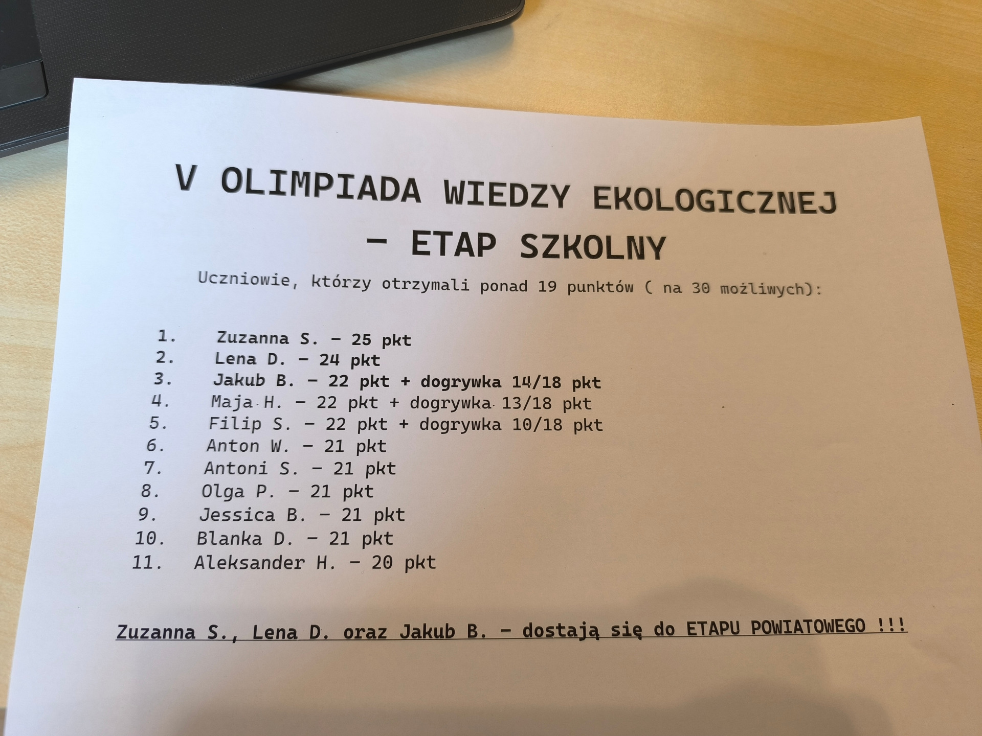 Do etapu powiatowego dostali się: Zuzanna S., Lena D. i Jakub B., uczniowie klasy VIII.