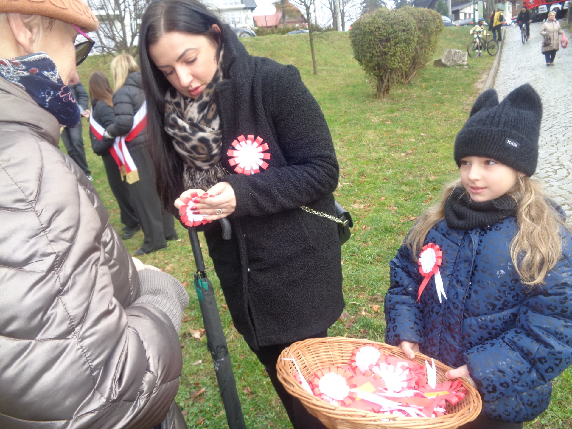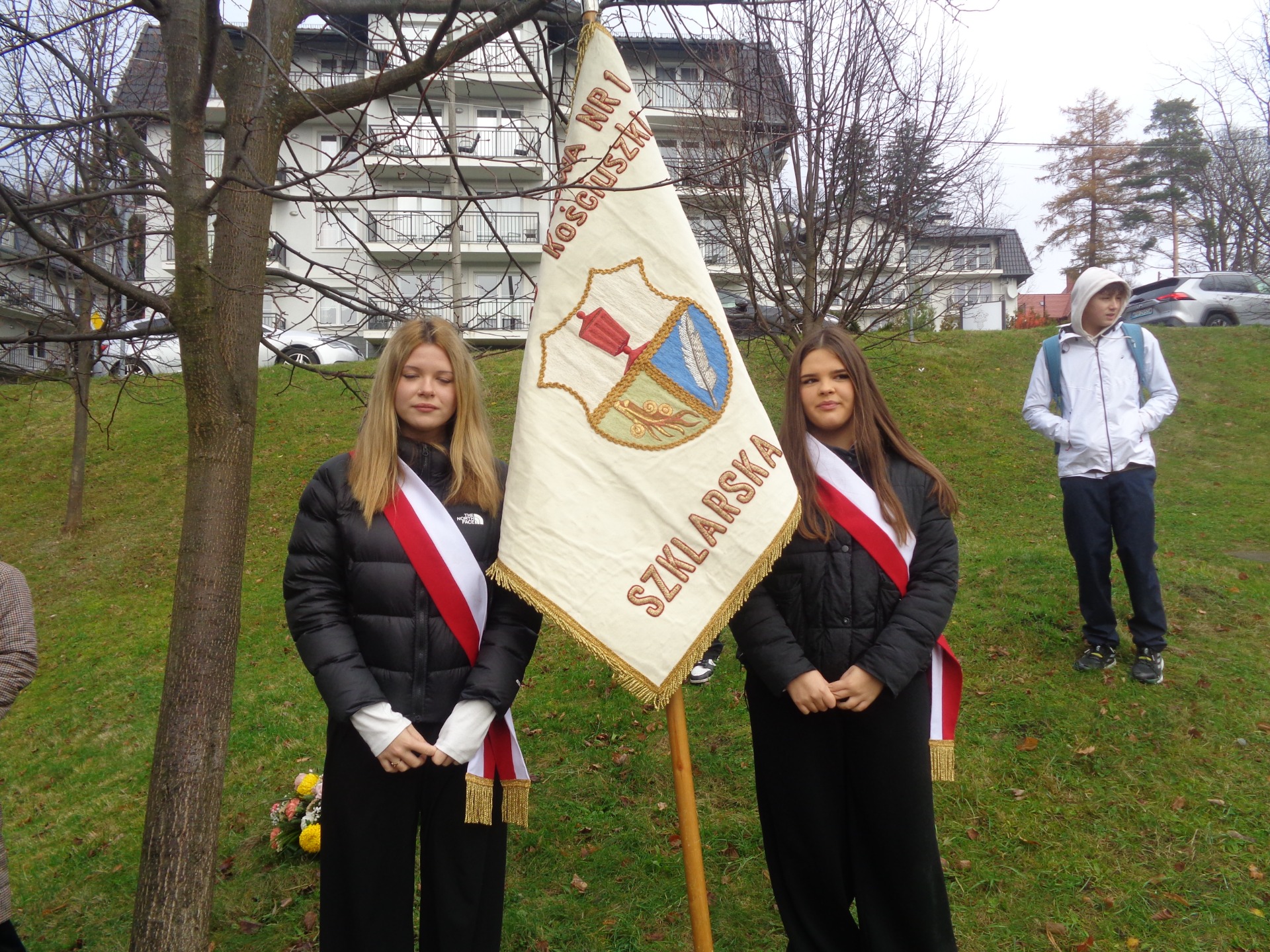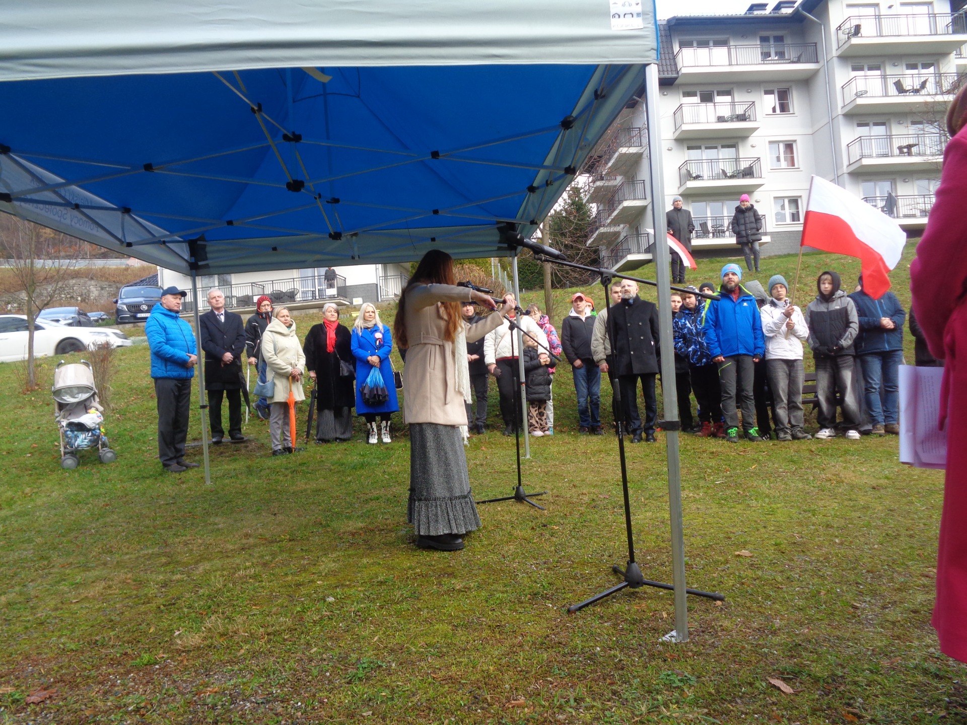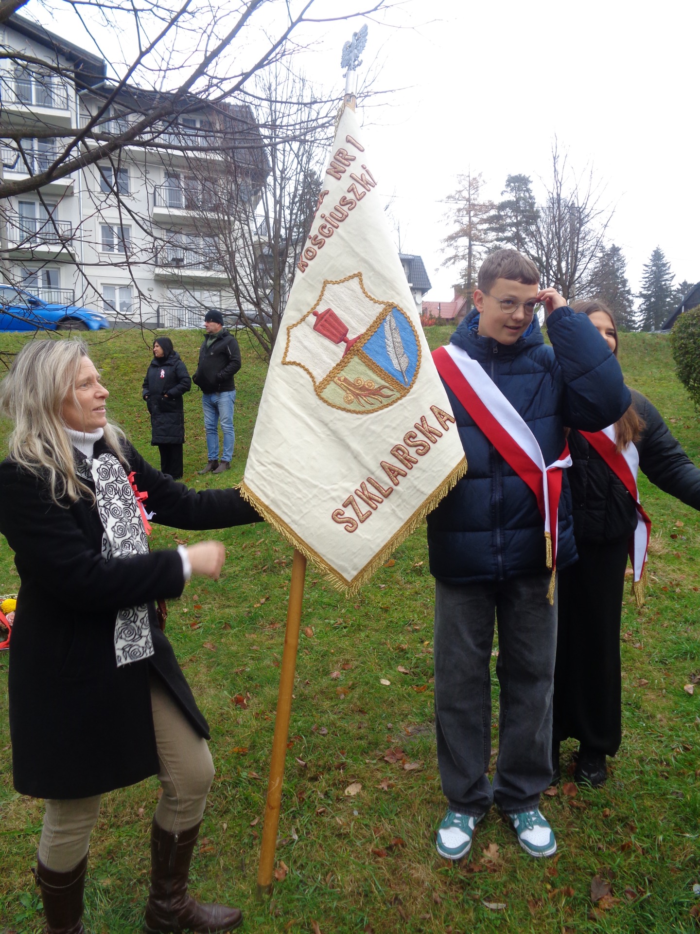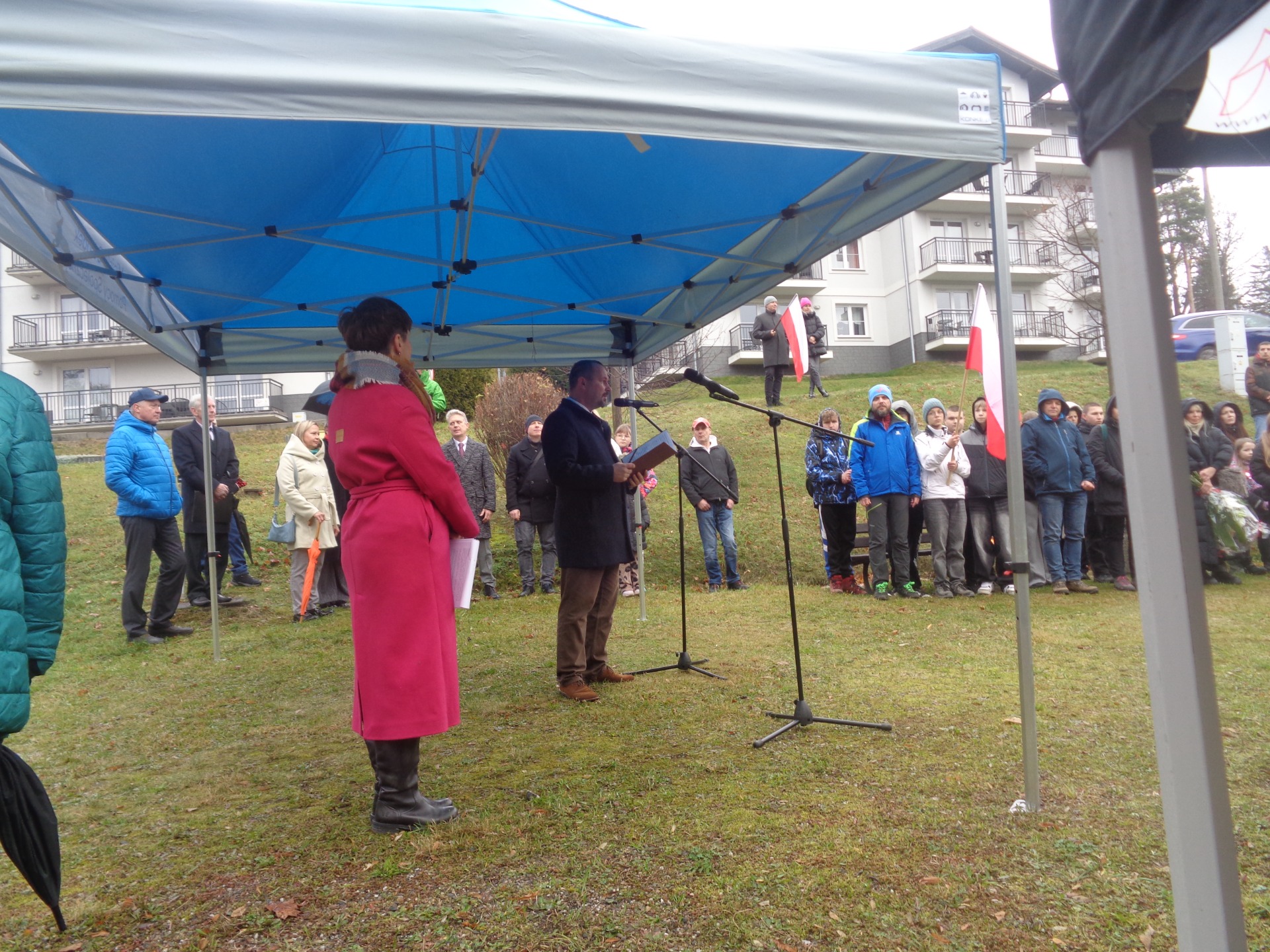 Uroczystość miejską poprowadziła Pani Katarzyna Harbul-Bała, prezeska Fundacji Boskie Karkonoskie, która zwróciła się do zebranych, by każdy przywitał swoich ,,sąsiadów". Przypomniała, że dzisiaj obchodzimy 107. rocznicę odzyskania niepodległości przez Polskę po 123 latach zaborów. Skrzypaczka, Katarzyna Lipert, zagrała utwór ,,Białe róże". Pan Andrzej Broś wygłosił wiersz ,,Bagnet na broń" Władysława Broniewskiego. Po wprowadzeniu sztandarów przez poczty sztandarowe (SP 1: Lena Kałafut, Zuzanna Siudak i Mateusz Olas) wszyscy zaśpiewali cztery zwrotki hymnu państwowego. Przemówienie okolicznościowe wygłosił Pan Paweł Popłoński, Burmistrz Szklarskiej Poręby, który podkreślił, jak ważna jest wolność dla każdego z nas. Pan Artur Cieślik, historyk i archiwista, pracownik Oddziałowego Biura Edukacji IPN, powiedział, w jaki sposób doszło do uzyskania niepodległości przez Polskę po I wojnie światowej. Przekazał Panu Burmistrzowi Ogień Niepodległości, który został złożony przez Pana Pawła Popłońskiego pod pomnikiem. Wyjaśnił, skąd się wzięła idea przekazywania tego płomienia.