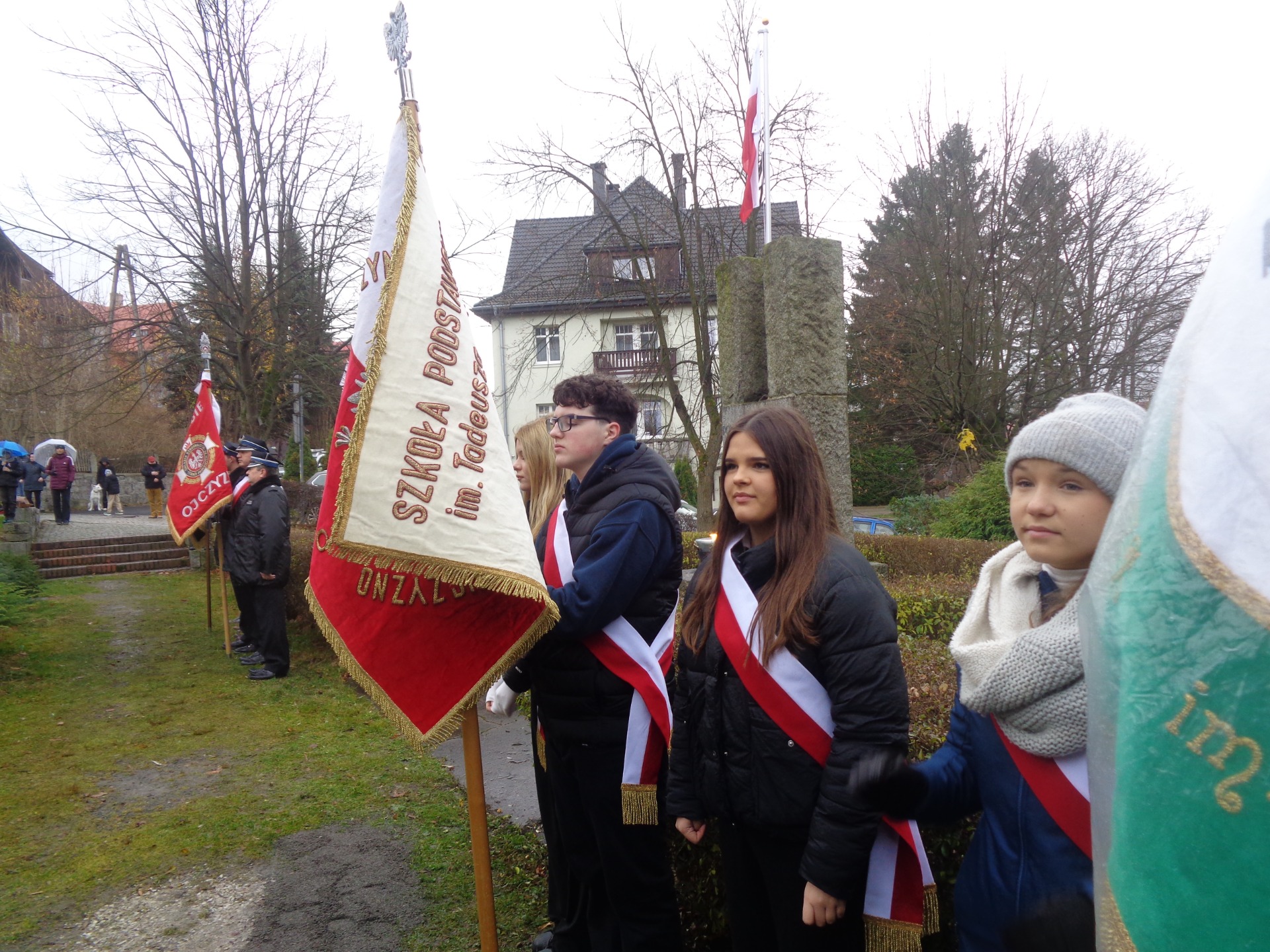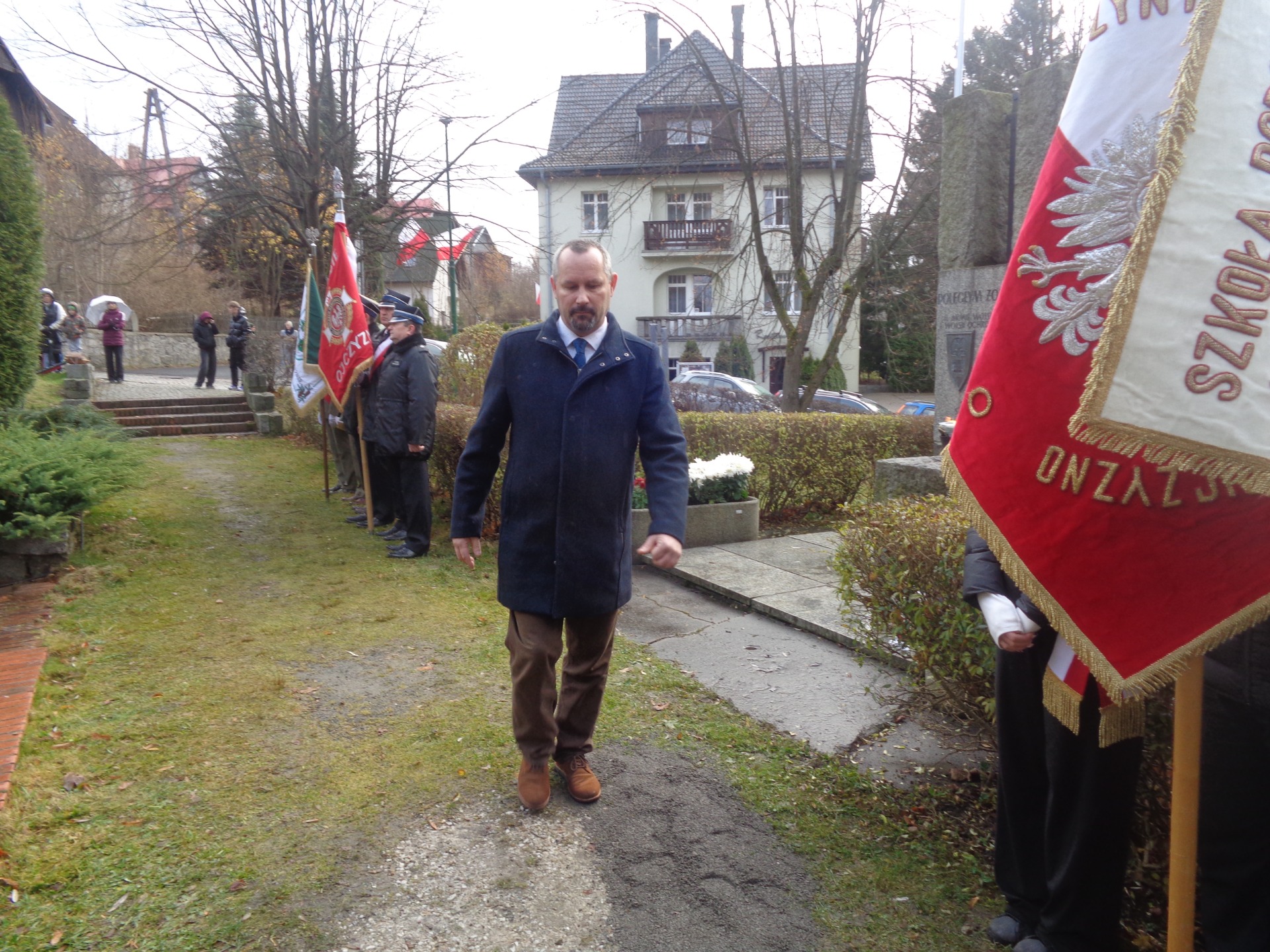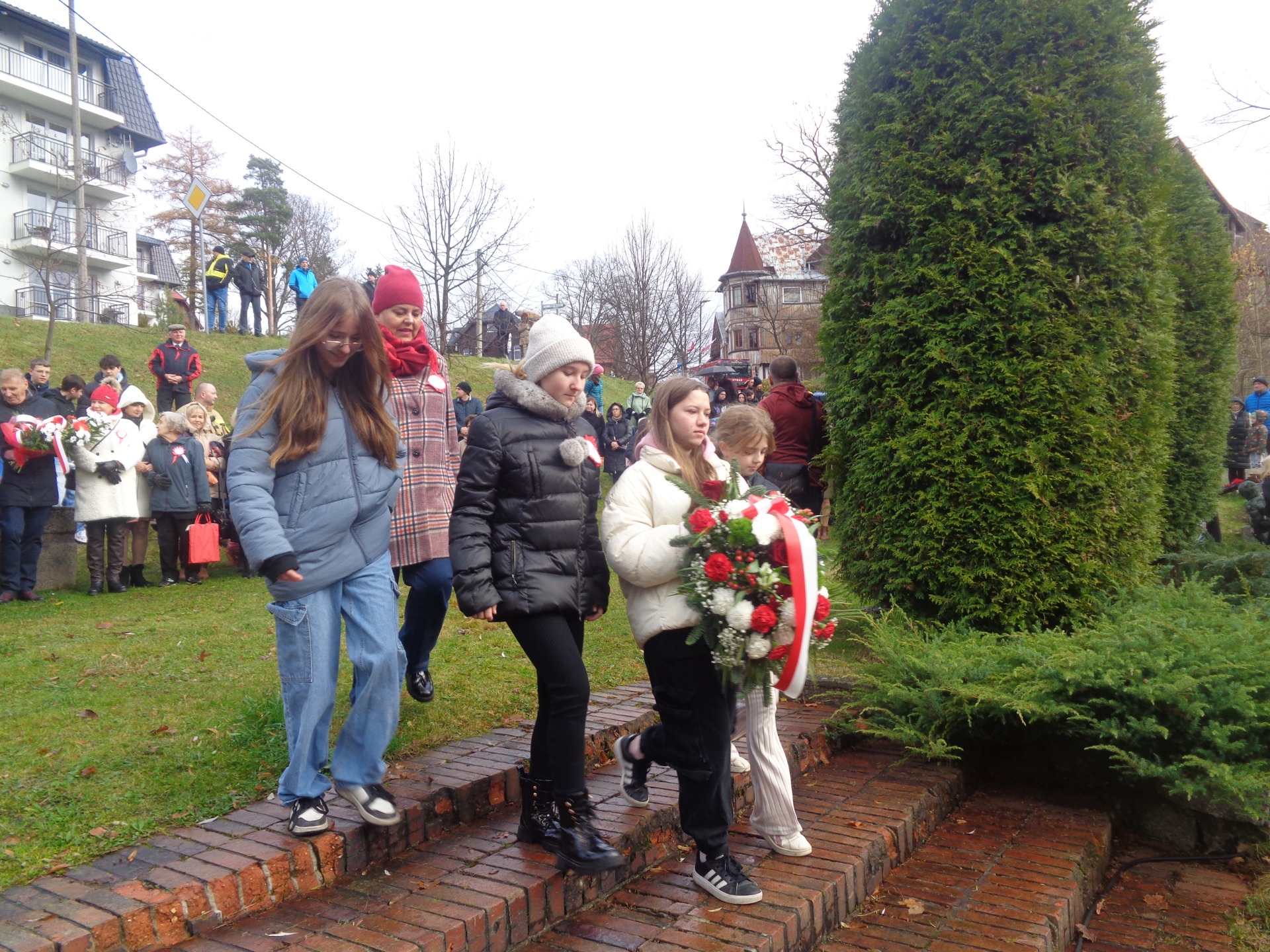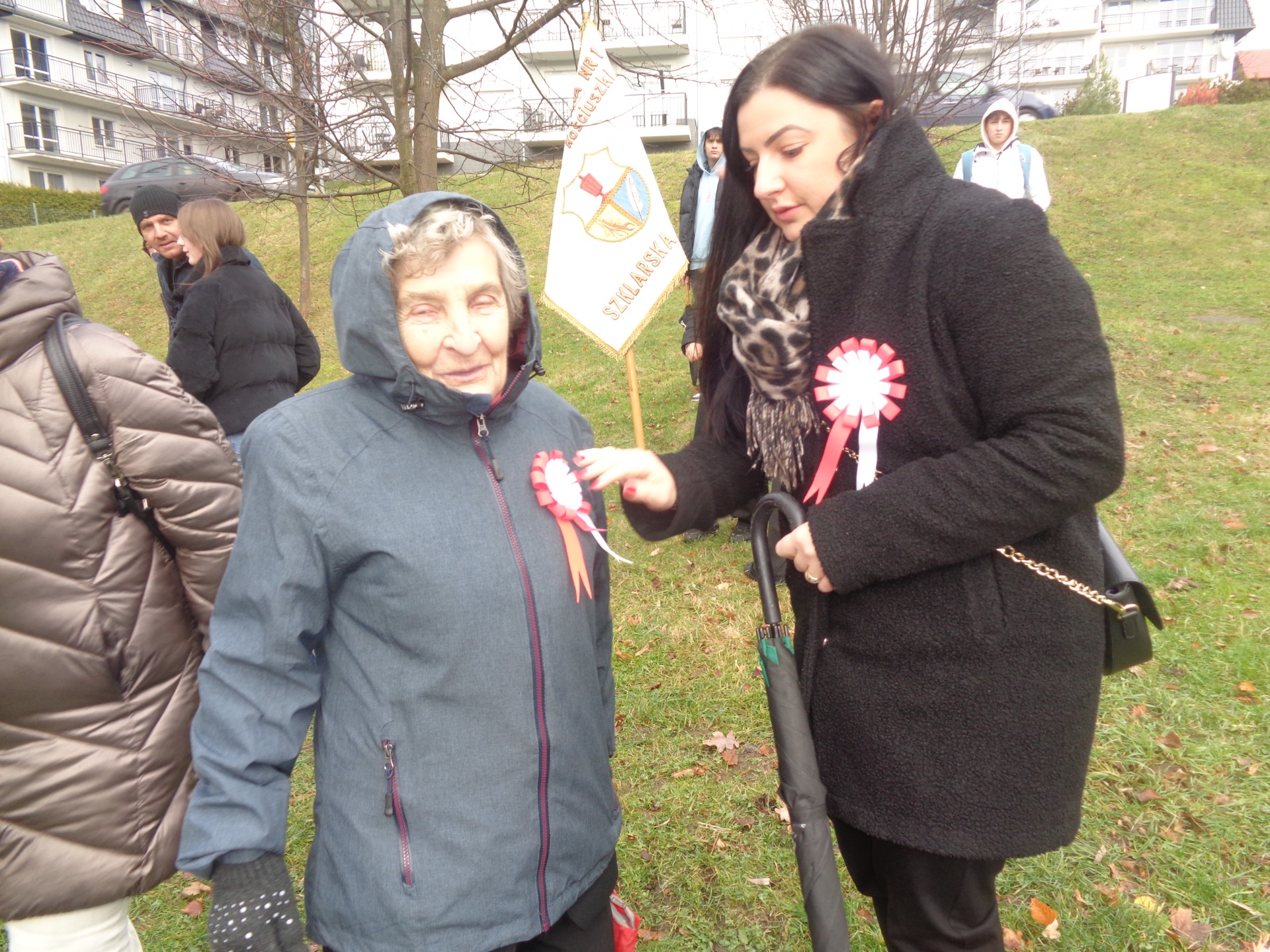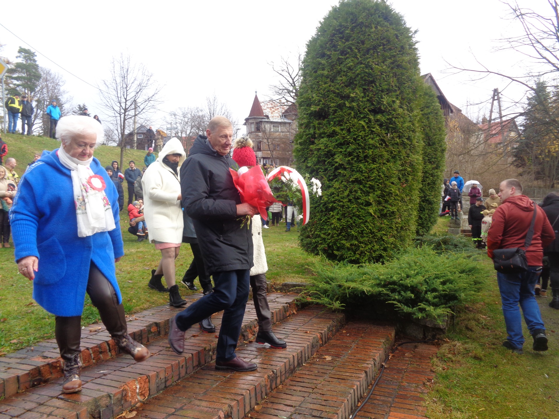 Uroczystość miejską poprowadziła Pani Katarzyna Harbul-Bała, prezeska Fundacji Boskie Karkonoskie, która zwróciła się do zebranych, by każdy przywitał swoich ,,sąsiadów". Przypomniała, że dzisiaj obchodzimy 107. rocznicę odzyskania niepodległości przez Polskę po 123 latach zaborów. Skrzypaczka, Katarzyna Lipert, zagrała utwór ,,Białe róże". Pan Andrzej Broś wygłosił wiersz ,,Bagnet na broń" Władysława Broniewskiego. Po wprowadzeniu sztandarów przez poczty sztandarowe (SP 1: Lena Kałafut, Zuzanna Siudak i Mateusz Olas) wszyscy zaśpiewali cztery zwrotki hymnu państwowego. Przemówienie okolicznościowe wygłosił Pan Paweł Popłoński, Burmistrz Szklarskiej Poręby, który podkreślił, jak ważna jest wolność dla każdego z nas. Pan Artur Cieślik, historyk i archiwista, pracownik Oddziałowego Biura Edukacji IPN, powiedział, w jaki sposób doszło do uzyskania niepodległości przez Polskę po I wojnie światowej. Przekazał Panu Burmistrzowi Ogień Niepodległości, który został złożony przez Pana Pawła Popłońskiego pod pomnikiem. Wyjaśnił, skąd się wzięła idea przekazywania tego płomienia.