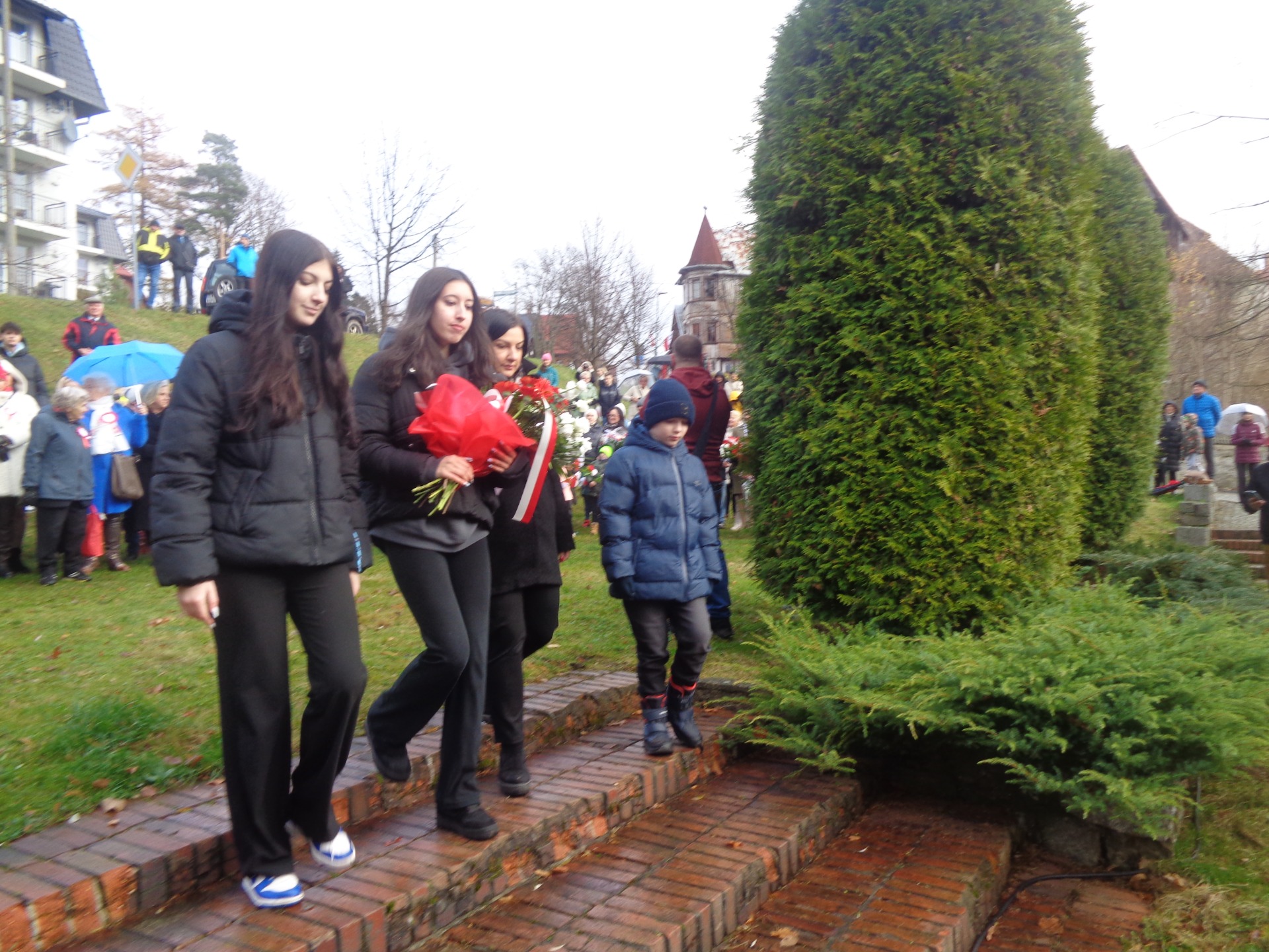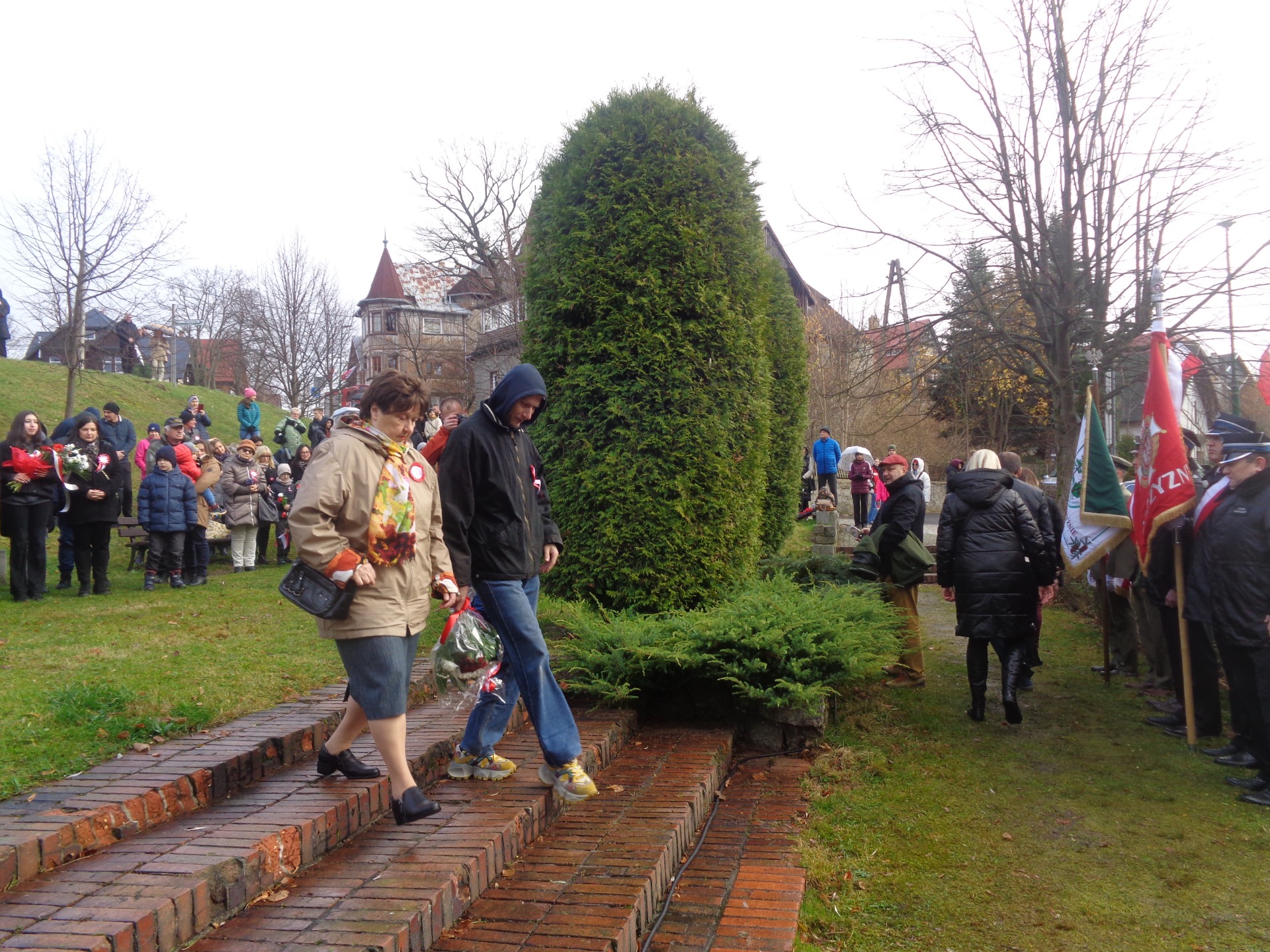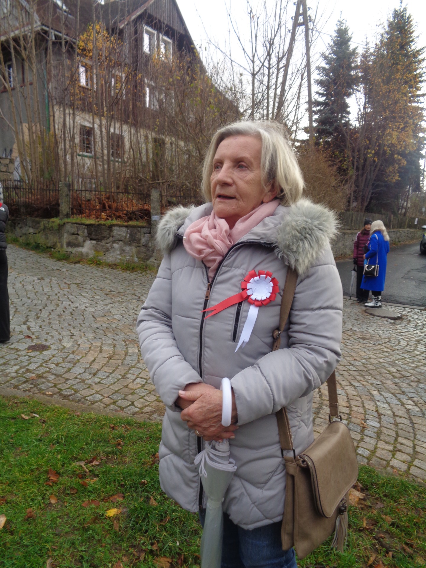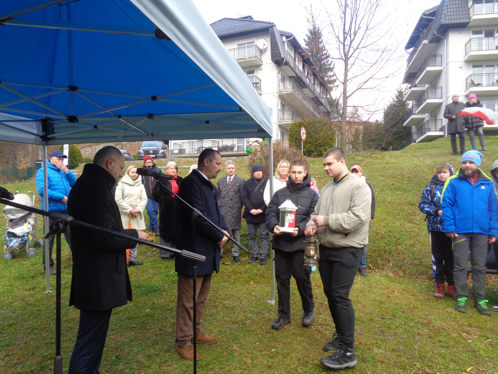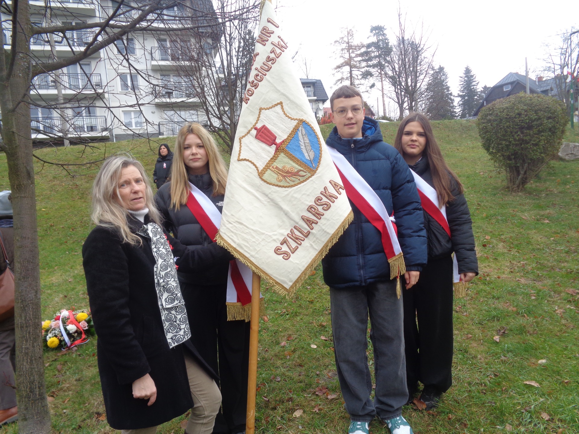 Uroczystość miejską poprowadziła Pani Katarzyna Harbul-Bała, prezeska Fundacji Boskie Karkonoskie, która zwróciła się do zebranych, by każdy przywitał swoich ,,sąsiadów". Przypomniała, że dzisiaj obchodzimy 107. rocznicę odzyskania niepodległości przez Polskę po 123 latach zaborów. Skrzypaczka, Katarzyna Lipert, zagrała utwór ,,Białe róże". Pan Andrzej Broś wygłosił wiersz ,,Bagnet na broń" Władysława Broniewskiego. Po wprowadzeniu sztandarów przez poczty sztandarowe (SP 1: Lena Kałafut, Zuzanna Siudak i Mateusz Olas) wszyscy zaśpiewali cztery zwrotki hymnu państwowego. Przemówienie okolicznościowe wygłosił Pan Paweł Popłoński, Burmistrz Szklarskiej Poręby, który podkreślił, jak ważna jest wolność dla każdego z nas. Pan Artur Cieślik, historyk i archiwista, pracownik Oddziałowego Biura Edukacji IPN, powiedział, w jaki sposób doszło do uzyskania niepodległości przez Polskę po I wojnie światowej. Przekazał Panu Burmistrzowi Ogień Niepodległości, który został złożony przez Pana Pawła Popłońskiego pod pomnikiem. Wyjaśnił, skąd się wzięła idea przekazywania tego płomienia.