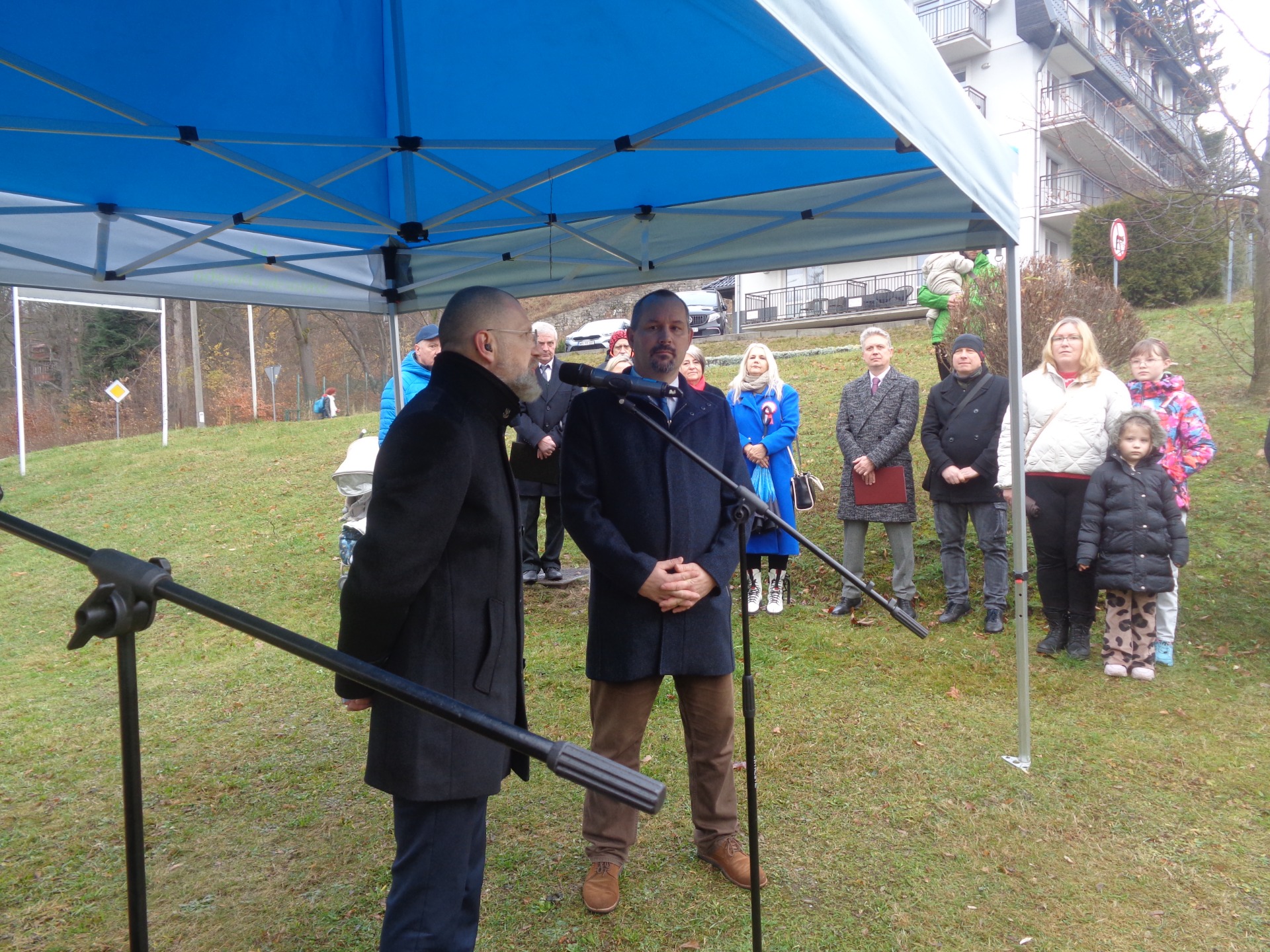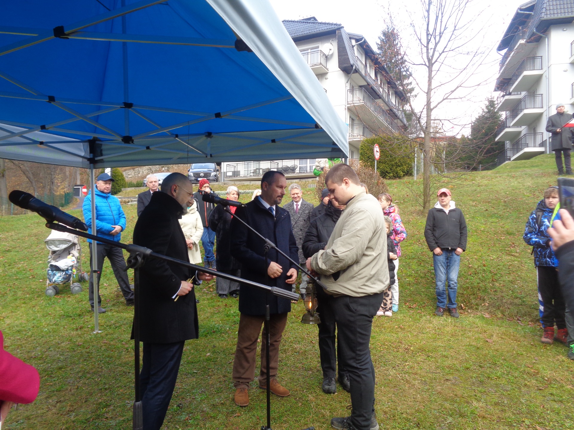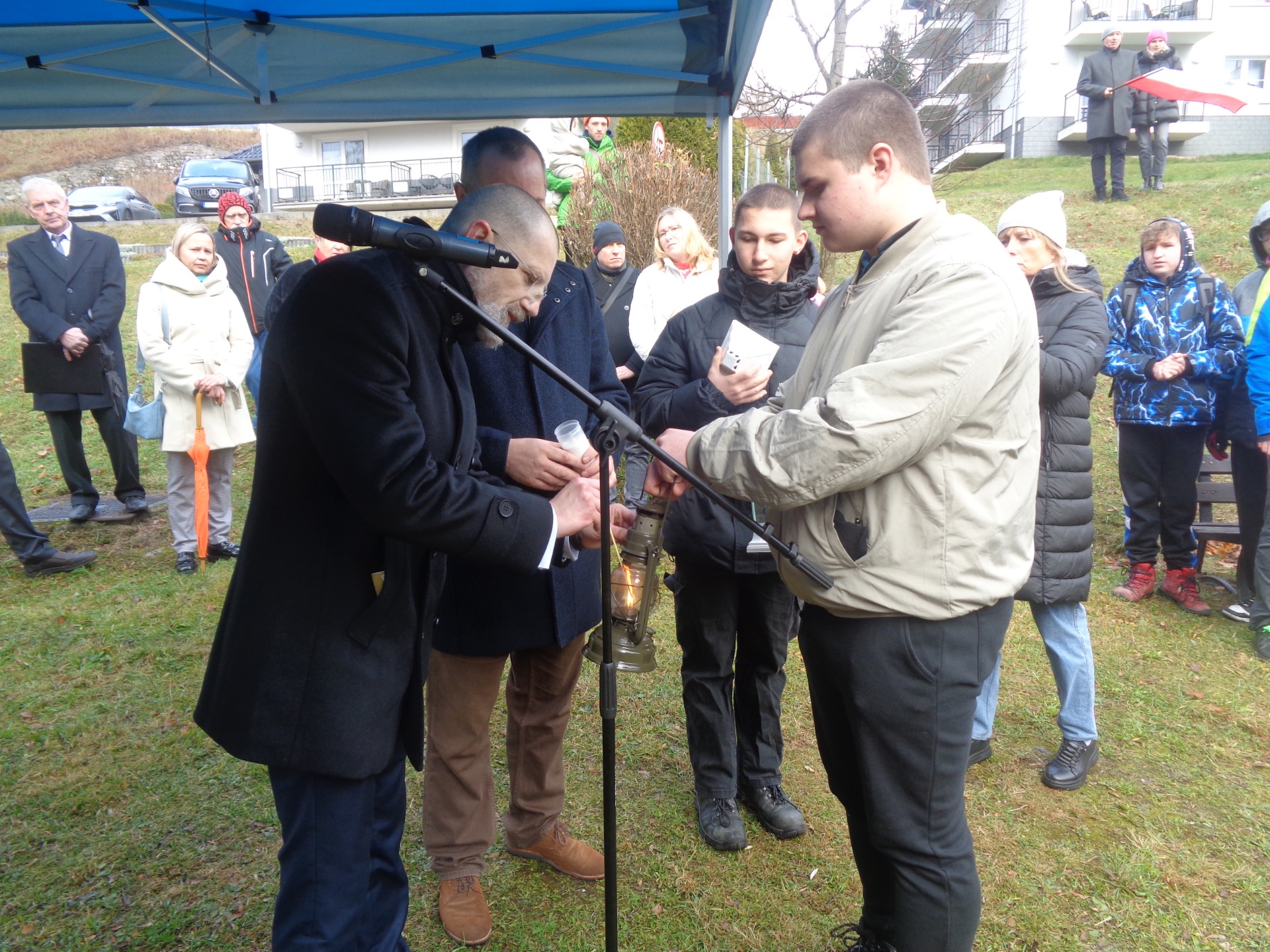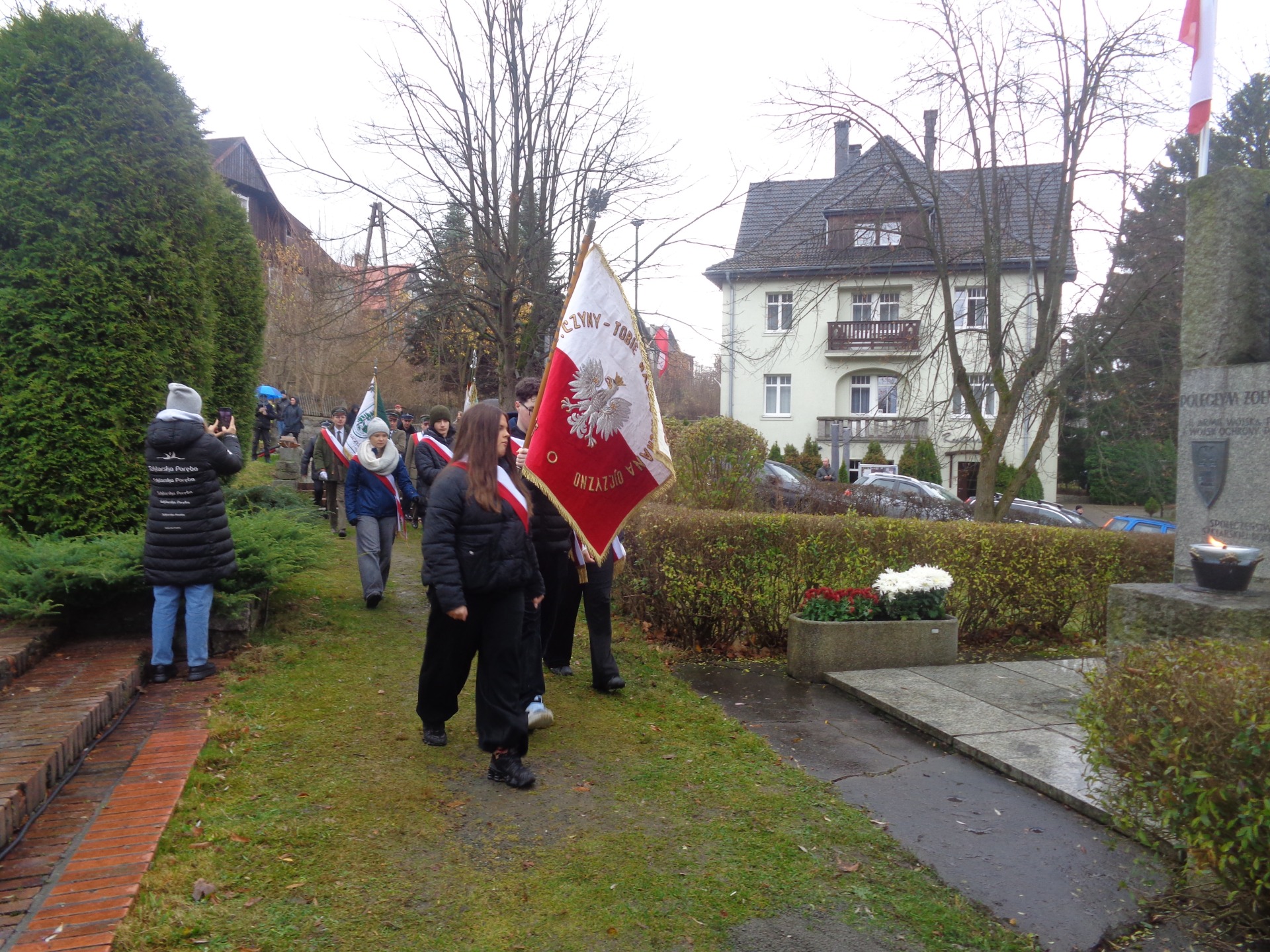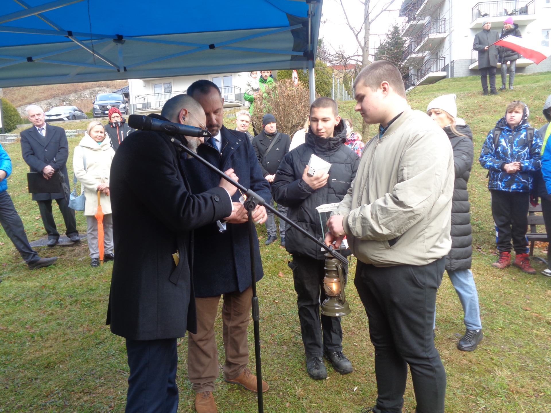 Uroczystość miejską poprowadziła Pani Katarzyna Harbul-Bała, prezeska Fundacji Boskie Karkonoskie, która zwróciła się do zebranych, by każdy przywitał swoich ,,sąsiadów". Przypomniała, że dzisiaj obchodzimy 107. rocznicę odzyskania niepodległości przez Polskę po 123 latach zaborów. Skrzypaczka, Katarzyna Lipert, zagrała utwór ,,Białe róże". Pan Andrzej Broś wygłosił wiersz ,,Bagnet na broń" Władysława Broniewskiego. Po wprowadzeniu sztandarów przez poczty sztandarowe (SP 1: Lena Kałafut, Zuzanna Siudak i Mateusz Olas) wszyscy zaśpiewali cztery zwrotki hymnu państwowego. Przemówienie okolicznościowe wygłosił Pan Paweł Popłoński, Burmistrz Szklarskiej Poręby, który podkreślił, jak ważna jest wolność dla każdego z nas. Pan Artur Cieślik, historyk i archiwista, pracownik Oddziałowego Biura Edukacji IPN, powiedział, w jaki sposób doszło do uzyskania niepodległości przez Polskę po I wojnie światowej. Przekazał Panu Burmistrzowi Ogień Niepodległości, który został złożony przez Pana Pawła Popłońskiego pod pomnikiem. Wyjaśnił, skąd się wzięła idea przekazywania tego płomienia.
