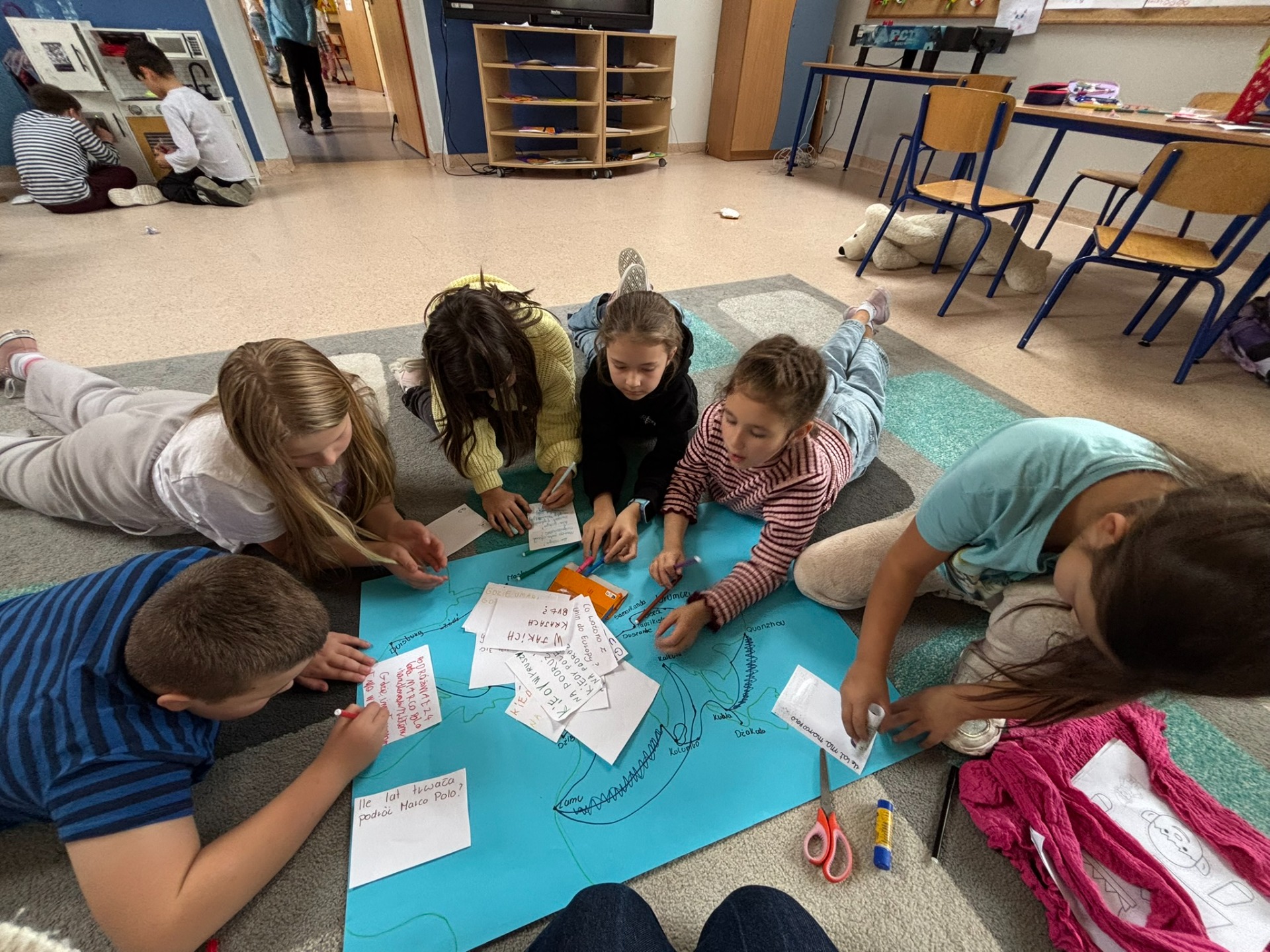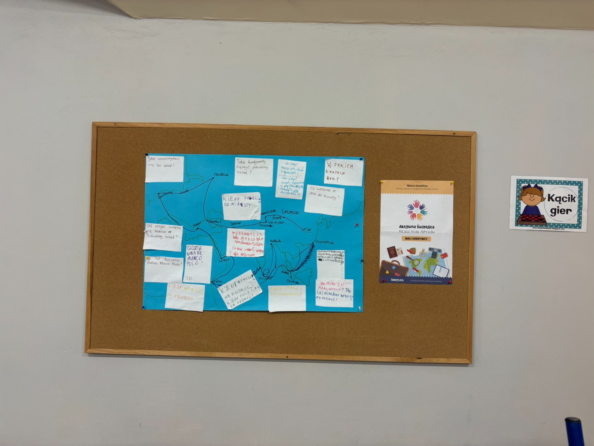 Kolejna część zajęć przeniosła nas na Jedwabny Szlak. Uczniowie wykonali dużą mapę na papierze ekologicznym lub brystolu, oznaczając Europę, Azję oraz najważniejsze miasta odwiedzone przez Marco Polo. Wzdłuż trasy znalazły się pytania i wyzwania, np. „Jak wyglądał jedwab?”, „Czym handlowano na Wschodzie?” czy „Jakie przyprawy przywożono do Europy?”. Dzieci mogły dzięki temu poznać realia życia kupców oraz znaczenie wymiany handlowej.